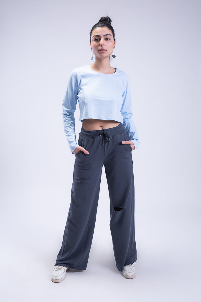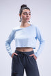 Plain Jane Long Sleeve Cropped Tee in Baby Blue. This light and airy basic, long-sleeve crop top features a classic crew neckline in an airy 100% cotton material in a regular fit.