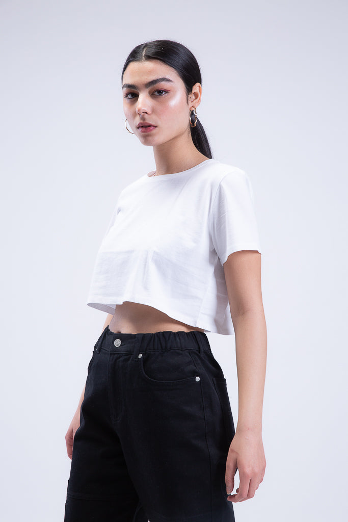 Short n Sweet Cropped Tee in Bright White. This light and airy basic, half-sleeve crop top features a classic crew neckline in an airy 100% cotton material in a regular fit. A wardrobe staple.