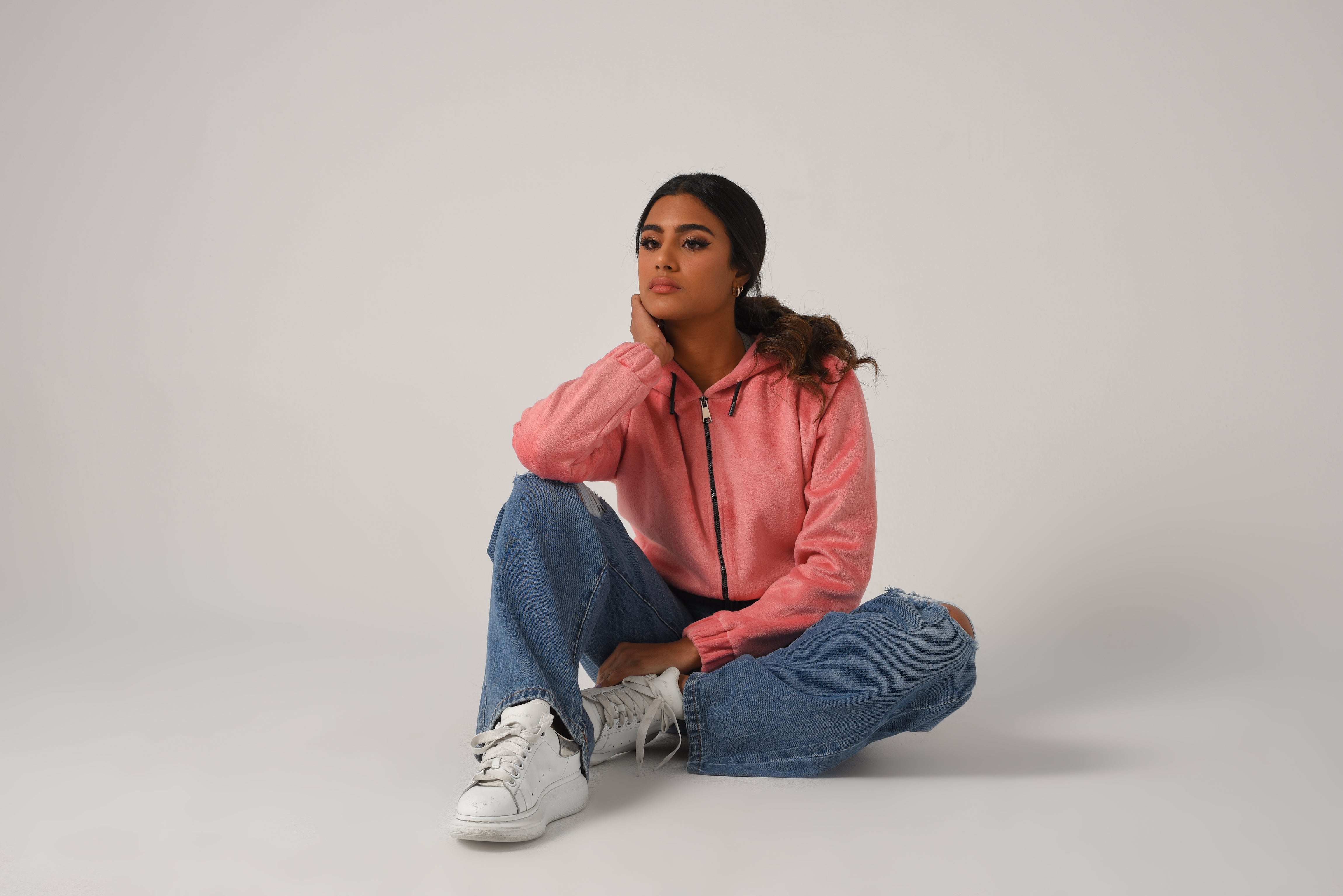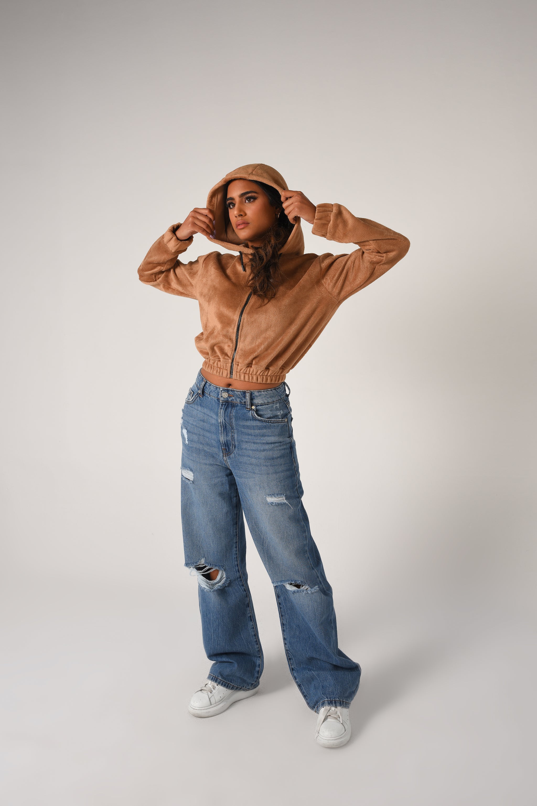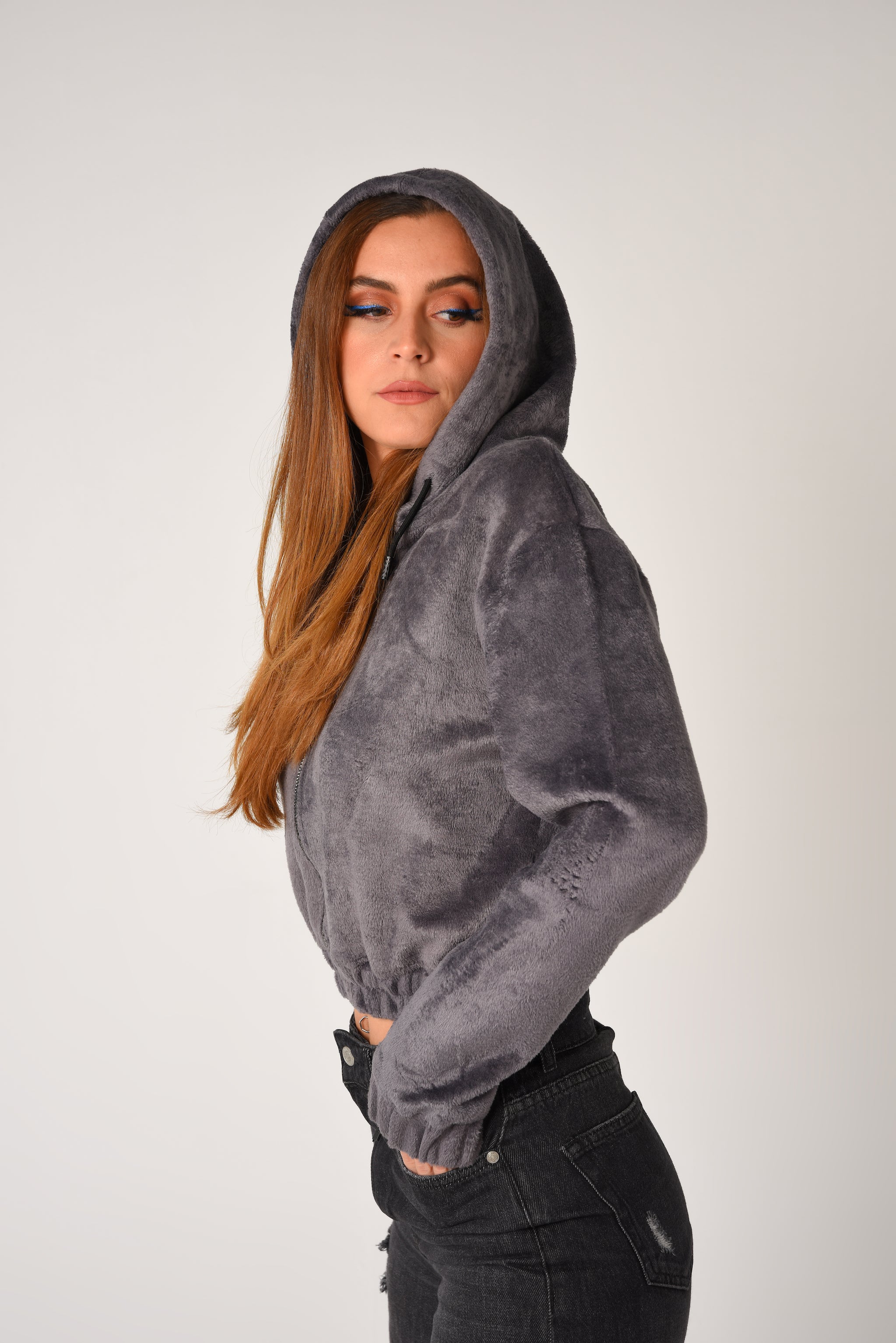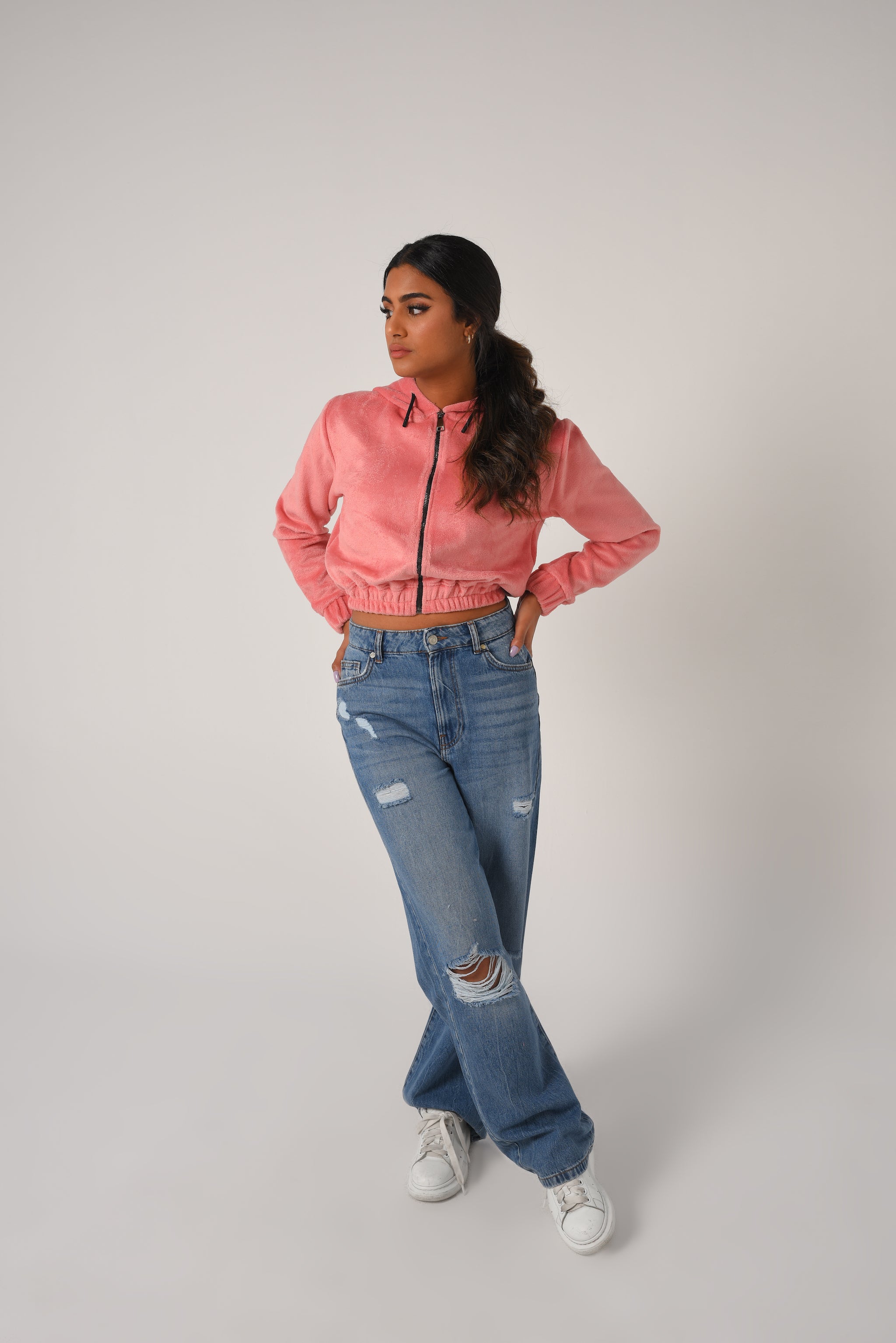Long sleeve jacket with an adjustable drawstring hood. Featuring front pockets, and a zip-up front.