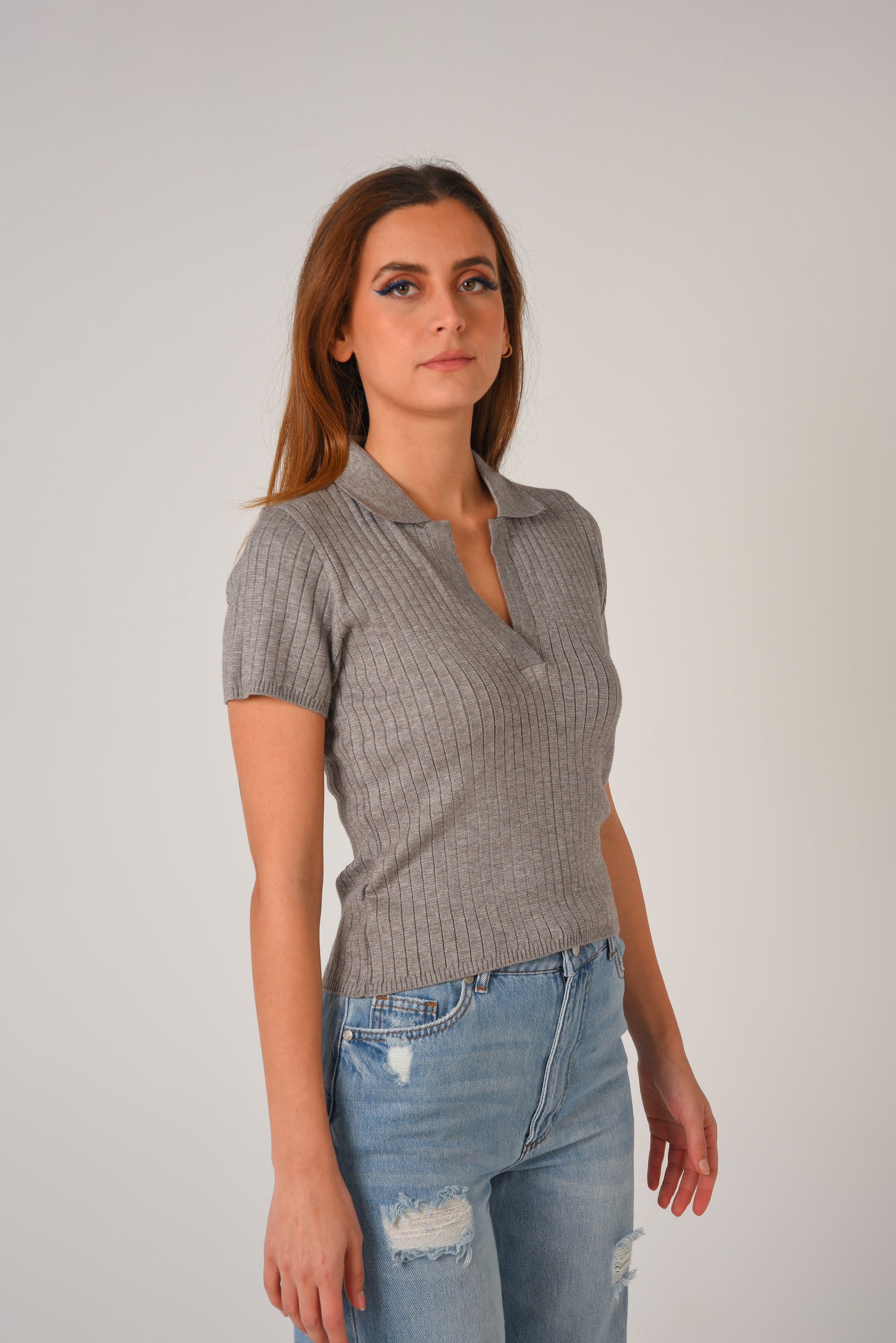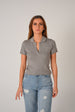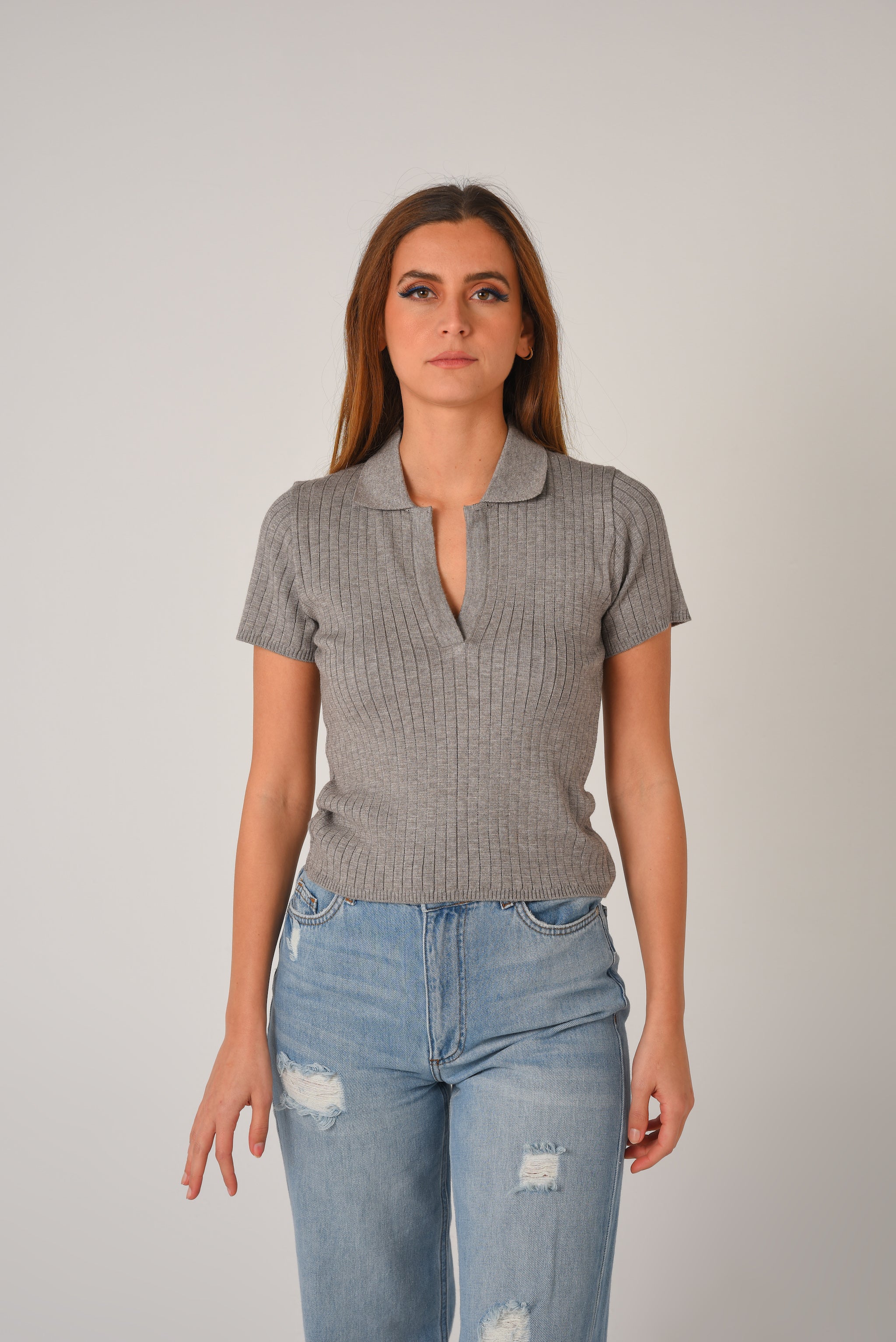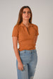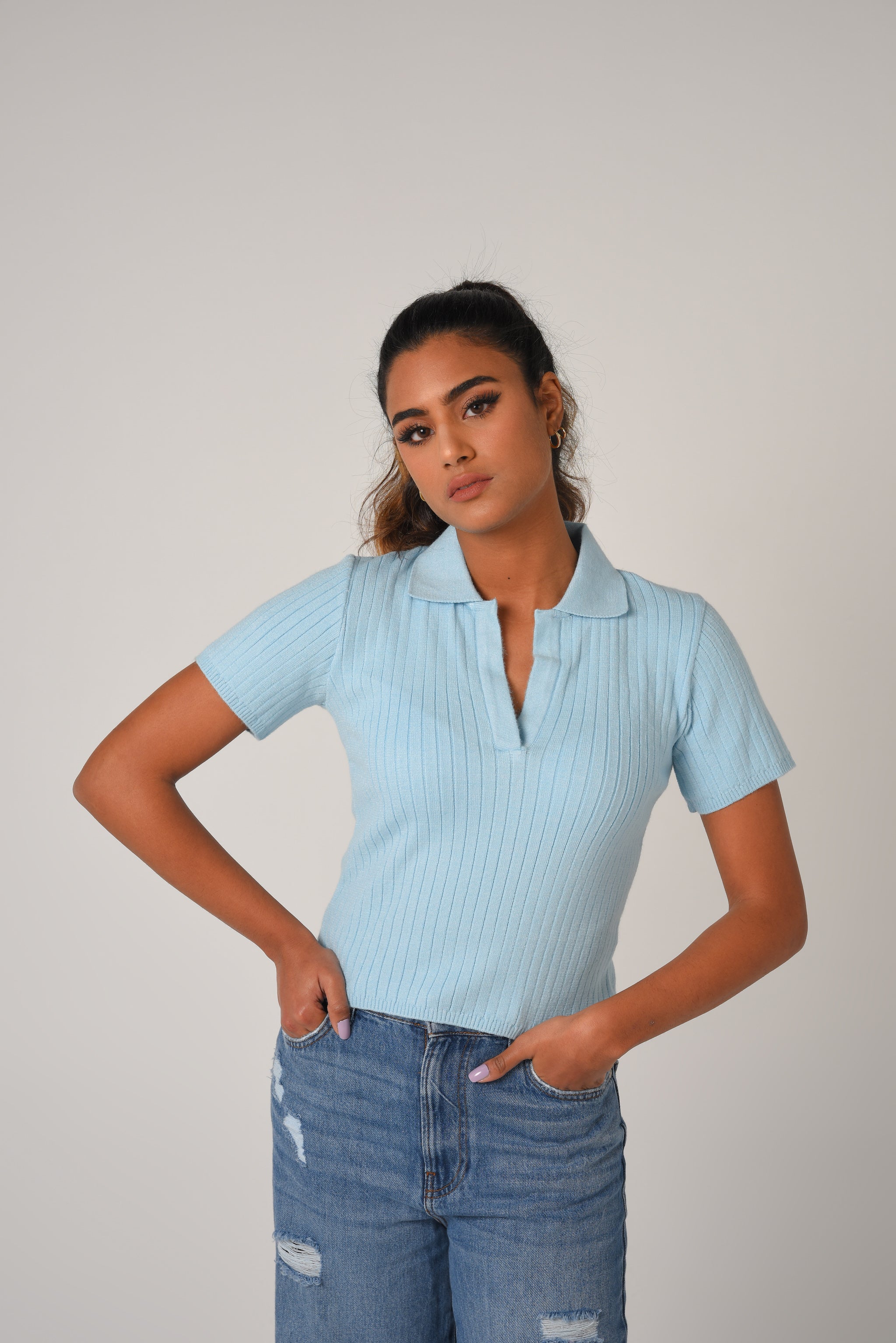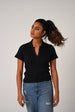 Fitted crop top in a fine rib-knit fabric. Featuring a preppy open collar and short sleeves.