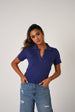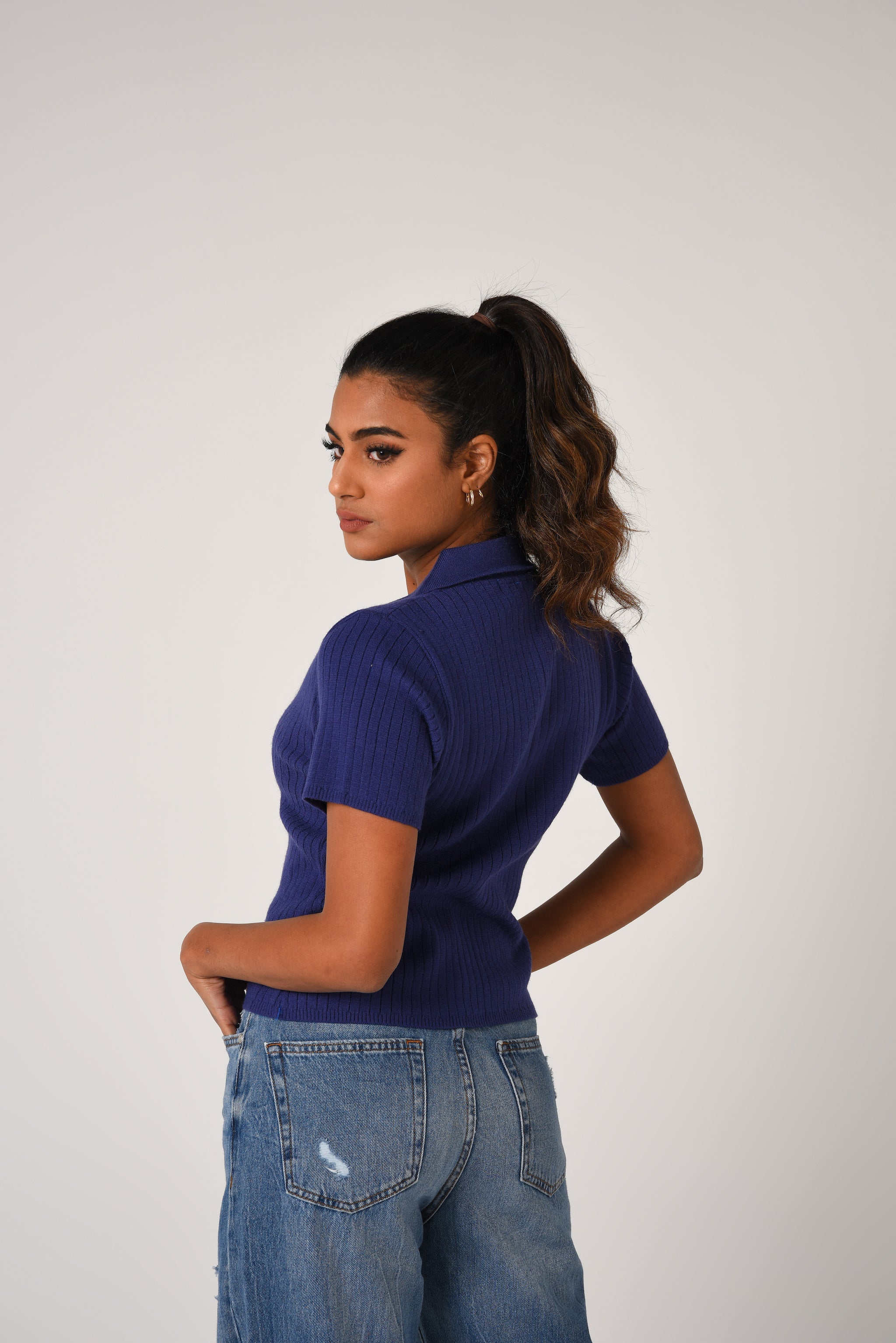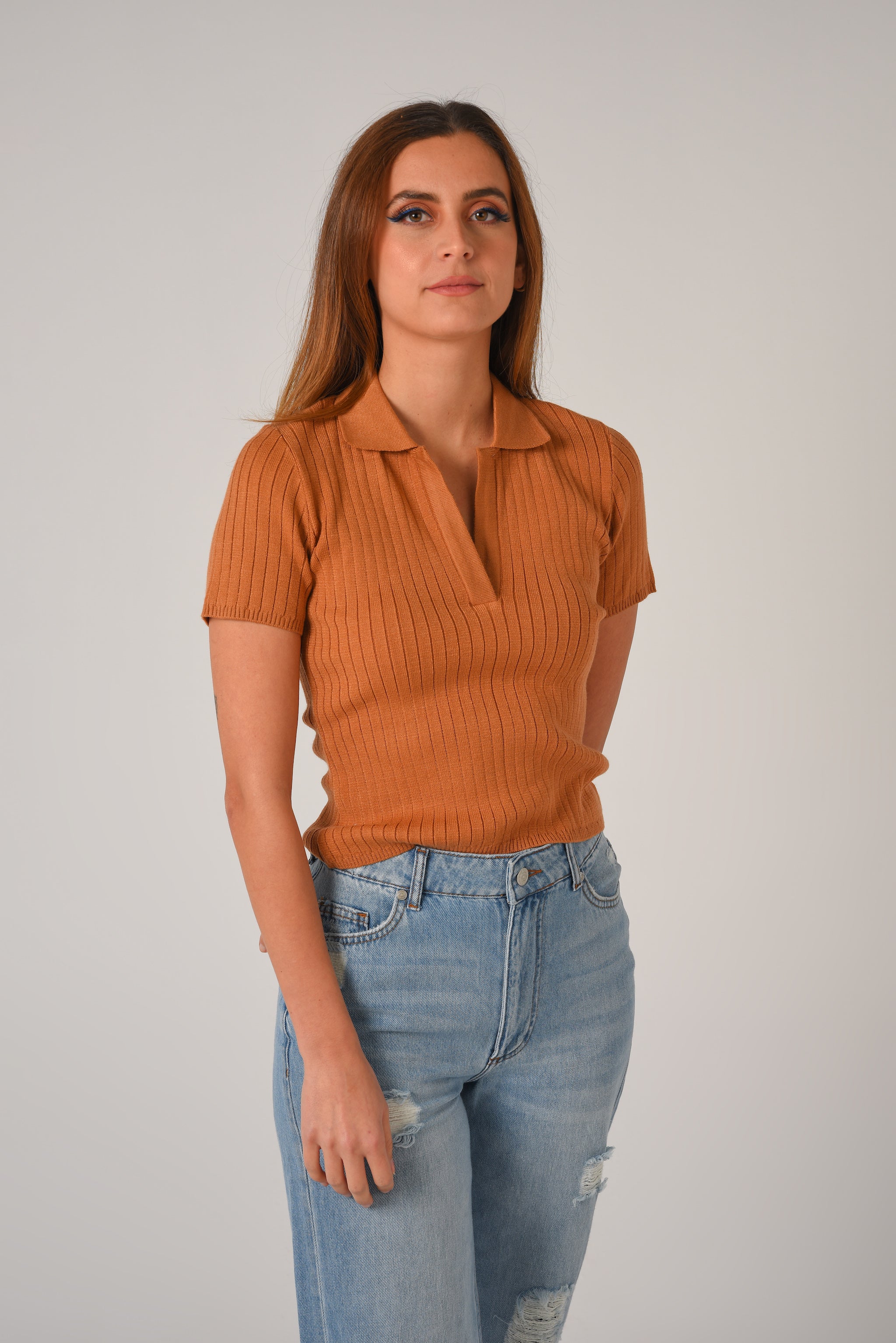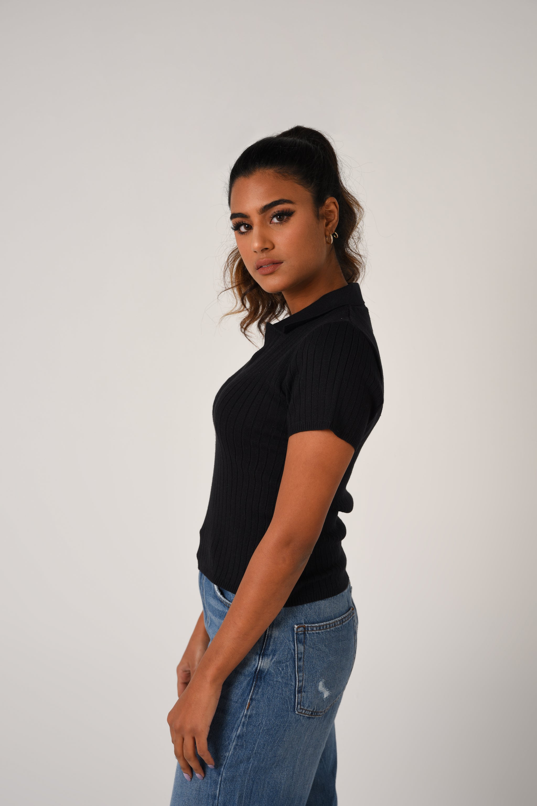 Fitted crop top in a fine rib-knit fabric. Featuring a preppy open collar and short sleeves.