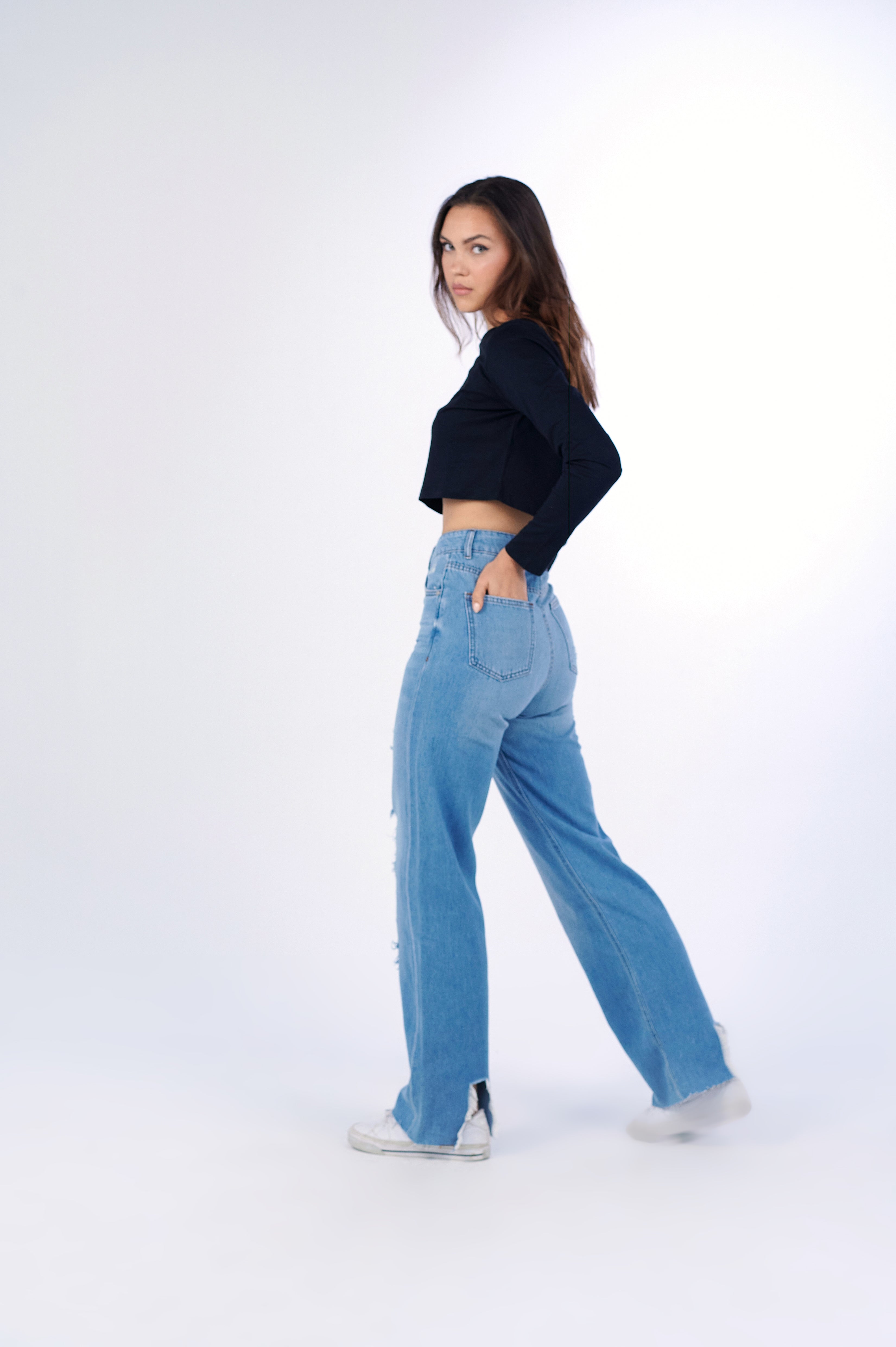 Plain Jane Long Sleeve Cropped Tee in Ink Black. This light and airy basic, long-sleeve crop top features a classic crew neckline in an airy 100% cotton material in a regular fit.Ê